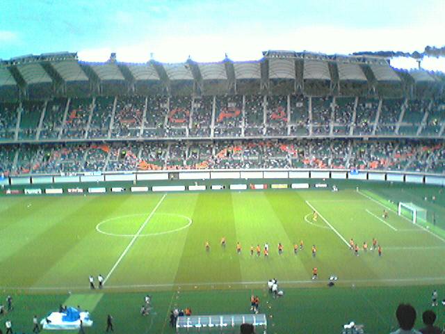 今日は半日休みで磐田-バルサ。15時半には他の人と車で会社を出たが、すごい混んでて(別にバルサ戦だからってことではなく、デフォルトでってことだと思うが)結局着くまでに2時間掛かった。さすがに今日はJの試合と違って人も多かった。思ったよりバルサファン(ユニ着た人)が多い…見た感じもあまり良いとは思わないような人の比率が高いとかそういうのは置いておきつつ、僕も記念にタオルマフラー(1,890円)は買った。でも今日も持ってたジュビロのタオルマフラーと違ってあまり持ち運んだりすることはないだろうな〜。今後ジュビロが友好関係をバルサと築いたりするならともかく…。あ、ジャパンのフェスに持っていけばいいか…。席の視点はこんな感じでとても良かった。メインスタンド2階の前の方。そりゃ8,000円ですから。記者席がすぐ近くにあった。試合開始15分程前から小室てつや夫妻が登場し、曲を演奏。この人達は大分のオフィシャルなサポーターだよな?何故ここに。どうやら使用しているシンセがヤマハだからとかそういう理由らしい。アイーダは外したと思った。